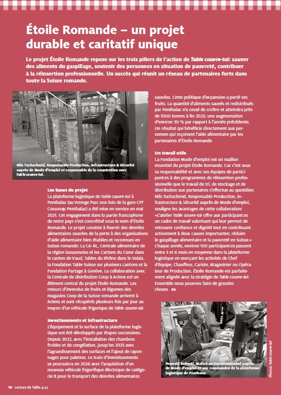Le projet Étoile Romande repose sur les trois piliers de l’action de Table couvre-toi : sauver des aliments du gaspillage, soutenir des personnes en situation de pauvreté et contribuer à la réinsertion professionnelle. Un succès qui réunit un réseau de partenaires forts dans toute la Suisse romande, dont la Fondation Mode d’emploi, qui gère l’atelier de tri de denrées alimentaires. Le numéro hiver 2025 du journal « Lecture de table », présente nos actions en faveur de cette mission.