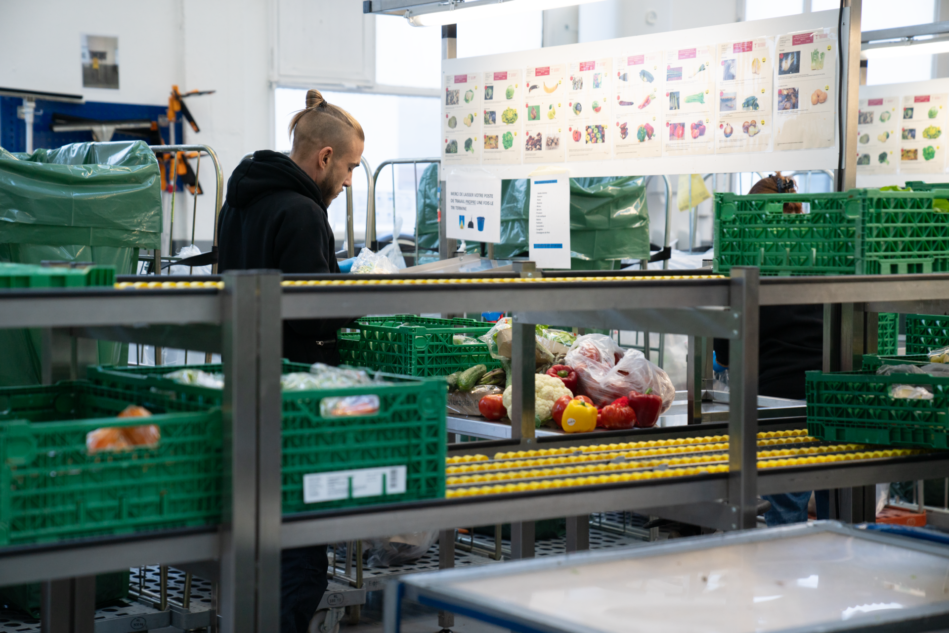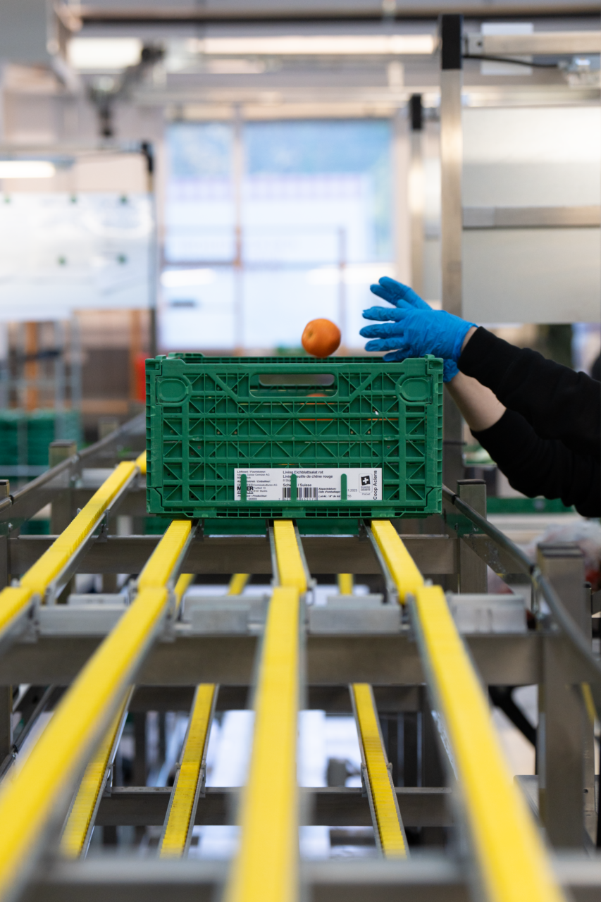 Tous les jours, des produits à reprendre en Suisse sont proposés depuis la centrale de coordination de Winterthur via un système informatique. Toute la problématique du tri de denrées alimentaires réside dans le juste équilibre à avoir entre la marchandise qui entre et celle qui sort. Comme il s’agit pour la majorité de produits périssables, il est important qu’il y ait un flux régulier (In and Out), d’où l’importance de s’assurer que la marchandise qui est acceptée soit écoulée. « On ne peut pas tout accepter non plus », nous explique un des maîtres socio-professionnels de l’atelier. « Par exemple, des pots de mayonnaise industriels de dix litres sont généralement très difficiles à redistribuer, ou encore des bacs de glace de deux litres lorsqu’on est hors saison. Sans parler des produits fragiles, comme les pêches. »